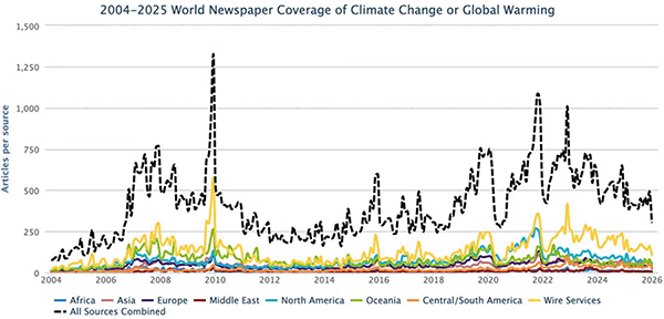 162. "Acquiescence:" David Wallace-Wells, "The World Seems to Be Surrendering to Climate Change," New York Times, April 23, 2025, online here; see also Wallace-Wells, "It Isn’t Just the U.S. The Whole World Has Soured on Climate Politics," New York Times, Sept. 16, 2025, online here; David Gelles, "How Wall Street Turned Its Back on Climate Change," New York Times, Jan. 17, 2026, online here.. Global media coverage: University of Colorado Media and Climate Change Observatory, "2025 Year End Retrospective," online here, see also Evlondo Cooper, "How broadcast TV networks covered climate change in 2025," MediaMatters, March 4, 2026, online here. Reporters fired: notably at CBS and the Washington Post, 2025-26; also the conservative Sinclair Broadcast Group takeover of local TV stations, and consolidation of local newspapers under conservative ownership, with general reductions of staff. BACK